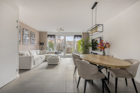 De woonkamer heeft een laminaatvloer, strak afgewerkte wanden en plafonds. In de keuken liggen tegels op de vloer, en de uitbouw heeft een laminaatvloer, schoon metselwerk wanden en een kunststof schroten plafond. Aan de voorzijde van de woning is een elektrisch rolluik geplaatst en bij de schuifpui aan de achterzijde een elektrisch screen.