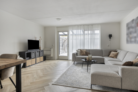 De woonkamer heeft een laminaatvloer, strak afgewerkte wanden en plafonds. In de keuken liggen tegels op de vloer, en de uitbouw heeft een laminaatvloer, schoon metselwerk wanden en een kunststof schroten plafond. Aan de voorzijde van de woning is een elektrisch rolluik geplaatst en bij de schuifpui aan de achterzijde een elektrisch screen.